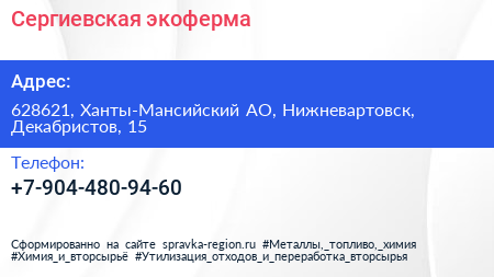 Сергиевская, экоферма по адресу 628621, Ханты-Мансийский АО, Нижневартовск, Декабристов, 15 в дальнейшем Организация, размещена в следующих категориях: