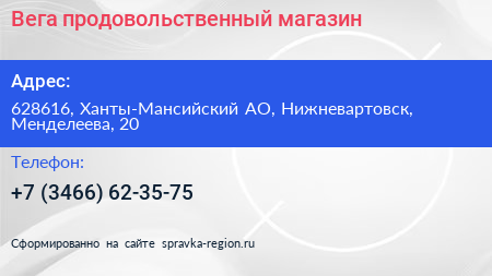 Вега, продовольственный магазин по адресу 628616, Ханты-Мансийский АО, Нижневартовск, Менделеева, 20 в дальнейшем Организация, размещена в следующих категориях: