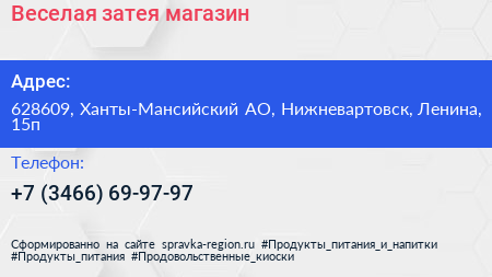 Веселая затея, магазин по адресу 628609, Ханты-Мансийский АО, Нижневартовск, Ленина, 15п в дальнейшем Организация, размещена в следующих категориях: