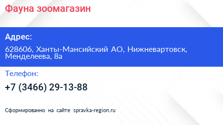Фауна, зоомагазин по адресу 628606, Ханты-Мансийский АО, Нижневартовск, Менделеева, 8а в дальнейшем Организация, размещена в следующих категориях: