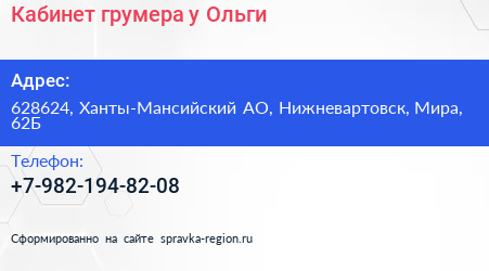 Кабинет грумера у Ольги по адресу 628624, Ханты-Мансийский АО, Нижневартовск, Мира, 62Б в дальнейшем Организация, размещена в следующих категориях: