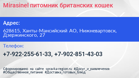 Mirasinel, питомник британских кошек по адресу 628615, Ханты-Мансийский АО, Нижневартовск, Дзержинского, 27 в дальнейшем Организация, размещена в следующих категориях:
