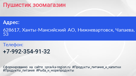 Пушистик, зоомагазин по адресу 628617, Ханты-Мансийский АО, Нижневартовск, Чапаева, 53 в дальнейшем Организация, размещена в следующих категориях: