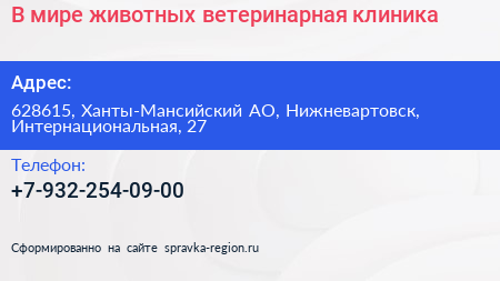 В мире животных, ветеринарная клиника по адресу 628615, Ханты-Мансийский АО, Нижневартовск, Интернациональная, 27 в дальнейшем Организация, размещена в следующих категориях: