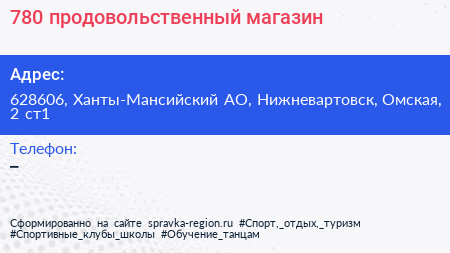 №780, продовольственный магазин по адресу 628606, Ханты-Мансийский АО, Нижневартовск, Омская, 2 ст1 в дальнейшем Организация, размещена в следующих категориях:
