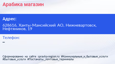 Арабика, магазин по адресу 628616, Ханты-Мансийский АО, Нижневартовск, Нефтяников, 19 в дальнейшем Организация, размещена в следующих категориях: