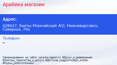 Арабика, магазин по адресу 628617, Ханты-Мансийский АО, Нижневартовск, Северная, 74а в дальнейшем Организация, размещена в следующих категориях: