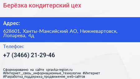 Берёзка, кондитерский цех по адресу 628601, Ханты-Мансийский АО, Нижневартовск, Лопарева, 4д в дальнейшем Организация, размещена в следующих категориях: