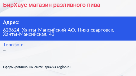 БирХаус, магазин разливного пива по адресу 628624, Ханты-Мансийский АО, Нижневартовск, Ханты-Мансийская, 43 в дальнейшем Организация, размещена в следующих категориях: