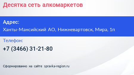 Десятка, сеть алкомаркетов по адресу Ханты-Мансийский АО, Нижневартовск, Мира, 1п в дальнейшем Организация, размещена в следующих категориях: