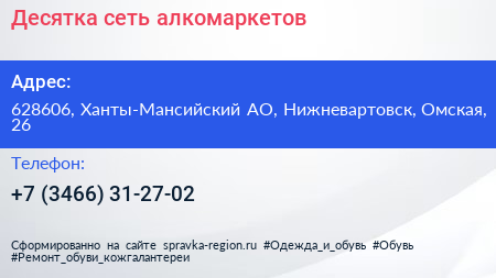 Десятка, сеть алкомаркетов по адресу 628606, Ханты-Мансийский АО, Нижневартовск, Омская, 26 в дальнейшем Организация, размещена в следующих категориях: