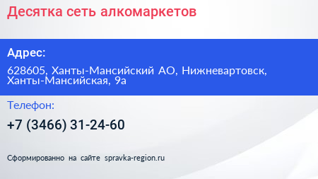 Десятка, сеть алкомаркетов по адресу 628605, Ханты-Мансийский АО, Нижневартовск, Ханты-Мансийская, 9а в дальнейшем Организация, размещена в следующих категориях: