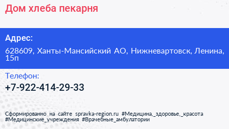 Дом хлеба, пекарня по адресу 628609, Ханты-Мансийский АО, Нижневартовск, Ленина, 15п в дальнейшем Организация, размещена в следующих категориях: