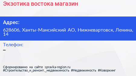 Экзотика востока, магазин по адресу 628606, Ханты-Мансийский АО, Нижневартовск, Ленина, 14 в дальнейшем Организация, размещена в следующих категориях: