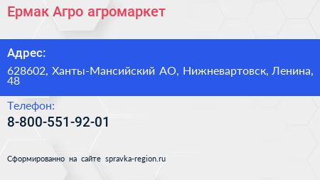 Ермак-Агро, агромаркет по адресу 628602, Ханты-Мансийский АО, Нижневартовск, Ленина, 48 в дальнейшем Организация, размещена в следующих категориях: