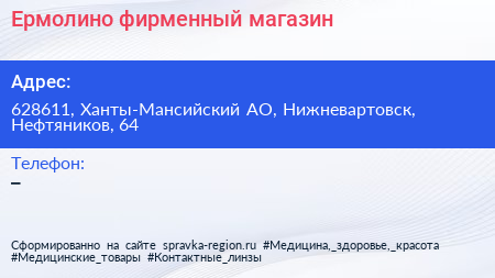 Ермолино, фирменный магазин по адресу 628611, Ханты-Мансийский АО, Нижневартовск, Нефтяников, 64 в дальнейшем Организация, размещена в следующих категориях:
