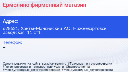 Ермолино, фирменный магазин по адресу 628621, Ханты-Мансийский АО, Нижневартовск, Заводская, 11 ст1 в дальнейшем Организация, размещена в следующих категориях: