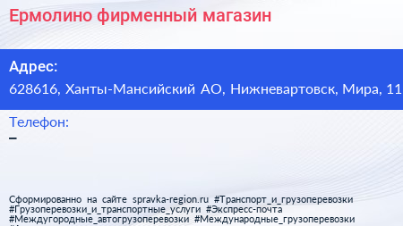Ермолино, фирменный магазин по адресу 628616, Ханты-Мансийский АО, Нижневартовск, Мира, 11 в дальнейшем Организация, размещена в следующих категориях: