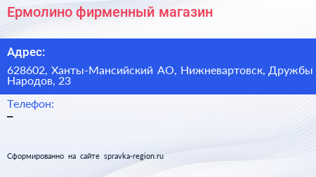 Ермолино, фирменный магазин по адресу 628602, Ханты-Мансийский АО, Нижневартовск, Дружбы Народов, 23 в дальнейшем Организация, размещена в следующих категориях: