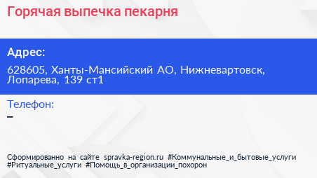Горячая выпечка, пекарня по адресу 628605, Ханты-Мансийский АО, Нижневартовск, Лопарева, 139 ст1 в дальнейшем Организация, размещена в следующих категориях: