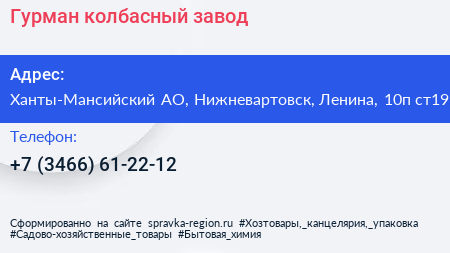 Гурман, колбасный завод по адресу Ханты-Мансийский АО, Нижневартовск, Ленина, 10п ст19 в дальнейшем Организация, размещена в следующих категориях: