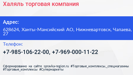 Халяль, торговая компания по адресу 628624, Ханты-Мансийский АО, Нижневартовск, Чапаева, 27 в дальнейшем Организация, размещена в следующих категориях: