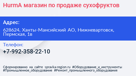 HurmA, магазин по продаже сухофруктов по адресу 628624, Ханты-Мансийский АО, Нижневартовск, Пермская, 1в в дальнейшем Организация, размещена в следующих категориях: