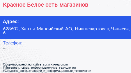 Красное & Белое, сеть магазинов по адресу 628602, Ханты-Мансийский АО, Нижневартовск, Чапаева, 6 в дальнейшем Организация, размещена в следующих категориях: