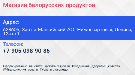 Магазин белорусских продуктов по адресу 628606, Ханты-Мансийский АО, Нижневартовск, Ленина, 12а ст1 в дальнейшем Организация, размещена в следующих категориях: