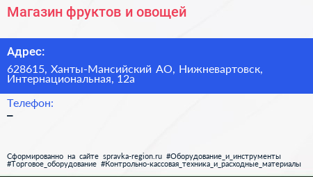 Магазин фруктов и овощей по адресу 628615, Ханты-Мансийский АО, Нижневартовск, Интернациональная, 12а в дальнейшем Организация, размещена в следующих категориях: