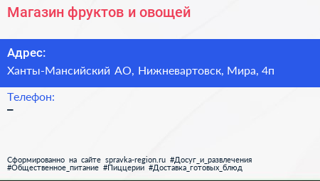 Магазин фруктов и овощей по адресу Ханты-Мансийский АО, Нижневартовск, Мира, 4п в дальнейшем Организация, размещена в следующих категориях: