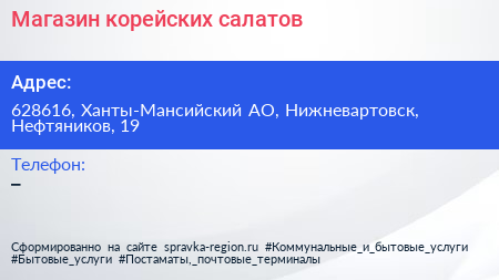 Магазин корейских салатов по адресу 628616, Ханты-Мансийский АО, Нижневартовск, Нефтяников, 19 в дальнейшем Организация, размещена в следующих категориях:
