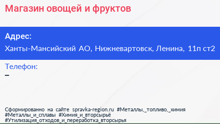 Магазин овощей и фруктов по адресу Ханты-Мансийский АО, Нижневартовск, Ленина, 11п ст2 в дальнейшем Организация, размещена в следующих категориях: