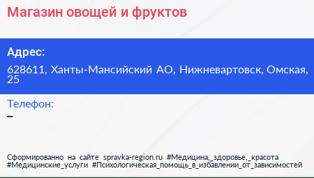 Магазин овощей и фруктов по адресу 628611, Ханты-Мансийский АО, Нижневартовск, Омская, 25 в дальнейшем Организация, размещена в следующих категориях:
