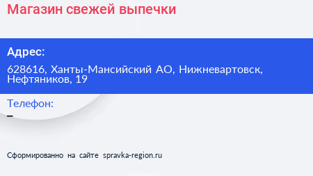 Магазин свежей выпечки по адресу 628616, Ханты-Мансийский АО, Нижневартовск, Нефтяников, 19 в дальнейшем Организация, размещена в следующих категориях:
