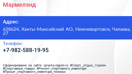 Мармелэнд по адресу 628624, Ханты-Мансийский АО, Нижневартовск, Чапаева, 27 в дальнейшем Организация, размещена в следующих категориях: