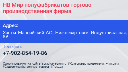 НВ Мир полуфабрикатов, торгово-производственная фирма по адресу Ханты-Мансийский АО, Нижневартовск, Индустриальная, 89 в дальнейшем Организация, размещена в следующих категориях: