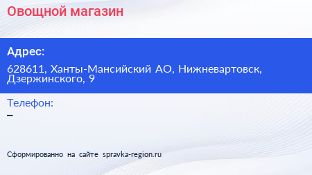 Овощной магазин по адресу 628611, Ханты-Мансийский АО, Нижневартовск, Дзержинского, 9 в дальнейшем Организация, размещена в следующих категориях: