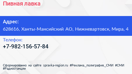 Пивная лавка по адресу 628616, Ханты-Мансийский АО, Нижневартовск, Мира, 4 в дальнейшем Организация, размещена в следующих категориях: