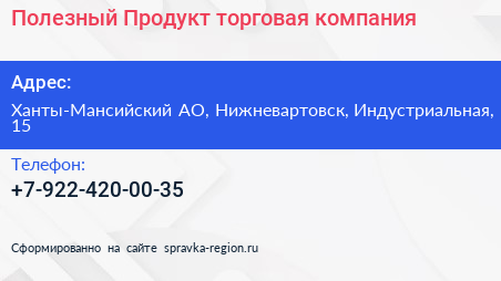 Полезный Продукт, торговая компания по адресу Ханты-Мансийский АО, Нижневартовск, Индустриальная, 15 в дальнейшем Организация, размещена в следующих категориях: