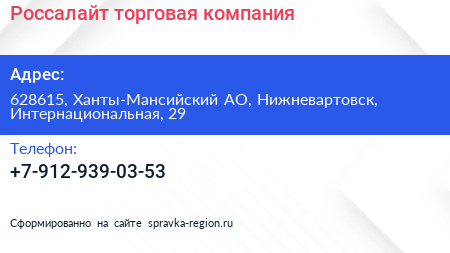 Россалайт, торговая компания по адресу 628615, Ханты-Мансийский АО, Нижневартовск, Интернациональная, 29 в дальнейшем Организация, размещена в следующих категориях: