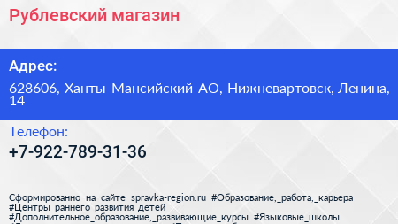 Рублевский, магазин по адресу 628606, Ханты-Мансийский АО, Нижневартовск, Ленина, 14 в дальнейшем Организация, размещена в следующих категориях: