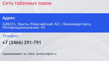 Сеть табачных лавок по адресу 628615, Ханты-Мансийский АО, Нижневартовск, Интернациональная, 41 в дальнейшем Организация, размещена в следующих категориях: