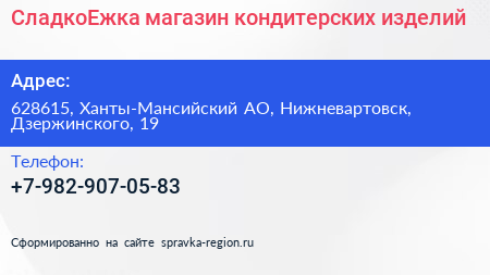 СладкоЕжка, магазин кондитерских изделий по адресу 628615, Ханты-Мансийский АО, Нижневартовск, Дзержинского, 19 в дальнейшем Организация, размещена в следующих категориях: