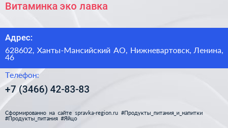 Витаминка, эко-лавка по адресу 628602, Ханты-Мансийский АО, Нижневартовск, Ленина, 46 в дальнейшем Организация, размещена в следующих категориях: