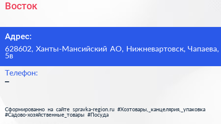 Восток по адресу 628602, Ханты-Мансийский АО, Нижневартовск, Чапаева, 5в в дальнейшем Организация, размещена в следующих категориях: