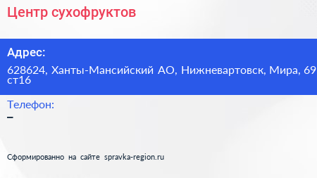 Центр сухофруктов по адресу 628624, Ханты-Мансийский АО, Нижневартовск, Мира, 69 ст16 в дальнейшем Организация, размещена в следующих категориях: