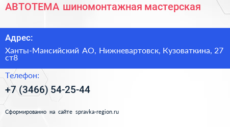 АВТОТЕМА, шиномонтажная мастерская по адресу Ханты-Мансийский АО, Нижневартовск, Кузоваткина, 27 ст8 в дальнейшем Организация, размещена в следующих категориях: