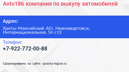 Avto186, компания по выкупу автомобилей по адресу Ханты-Мансийский АО, Нижневартовск, Интернациональная, 5п ст2 в дальнейшем Организация, размещена в следующих категориях: