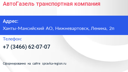 АвтоГазель, транспортная компания по адресу Ханты-Мансийский АО, Нижневартовск, Ленина, 2п в дальнейшем Организация, размещена в следующих категориях: